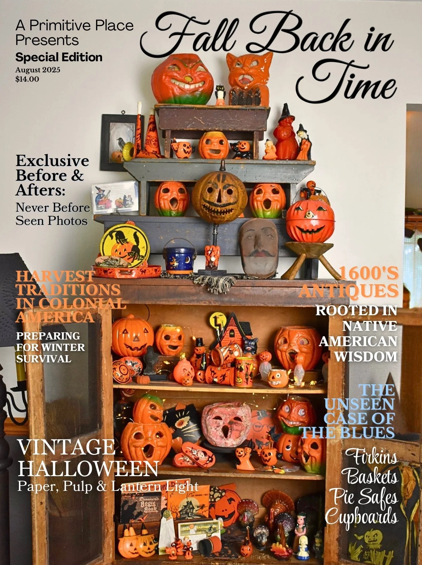 Most recently, my personal antique Halloween collection was showcased on the cover of A Primitive Place Magazine’s Fall Back in Time Special Edition Issue. This feature was shot in my home in Summer 2025.